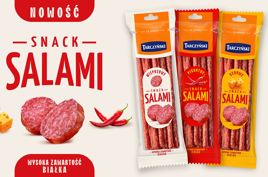 Dynamiczny, ponad 30-procentowy wzrost rynku salami w ostatnich dwóch latach otworzył przestrzeń dla innowacji . Marka Tarczyński dostrzega ten potencjał i proponuje konsumentom unikalny format Salami Snack, wzbogacając ofertę o produkt, który jest zupełną nowością w asortymencie i na pewno ucieszy wszystkich fanów mięsnych przekąsek.