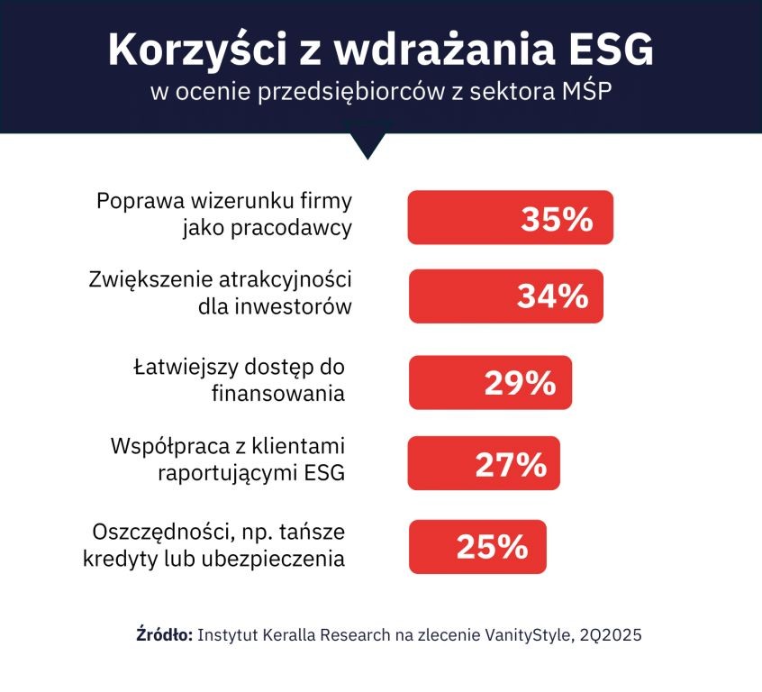 Zgodnie z danymi zebranymi na zlecenie VanityStyle, główną korzyścią związaną z ESG, którą dostrzega 35 proc. przedsiębiorców z sektora MŚP, jest poprawa wizerunku firmy jako pracodawcy. To kwestia szczególnie ważna dla przedstawicieli średnich podmiotów oraz firm produkcyjnych (po 42 proc. wskazań). Kolejnym aspektami istotnymi dla reprezentantów sektora są zwiększenie trakcyjności dla inwestorów (34 proc. wskazań) oraz lepszy dostęp do finansowania, np. inwestycji (29 proc. wskazań).