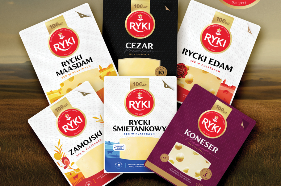- Autorskie ilustracje inspirowane krajobrazem Ryk i rytmem pracy mleczarni – wprowadzone na opakowania jako element budujący opowieść o pochodzeniu produktów.