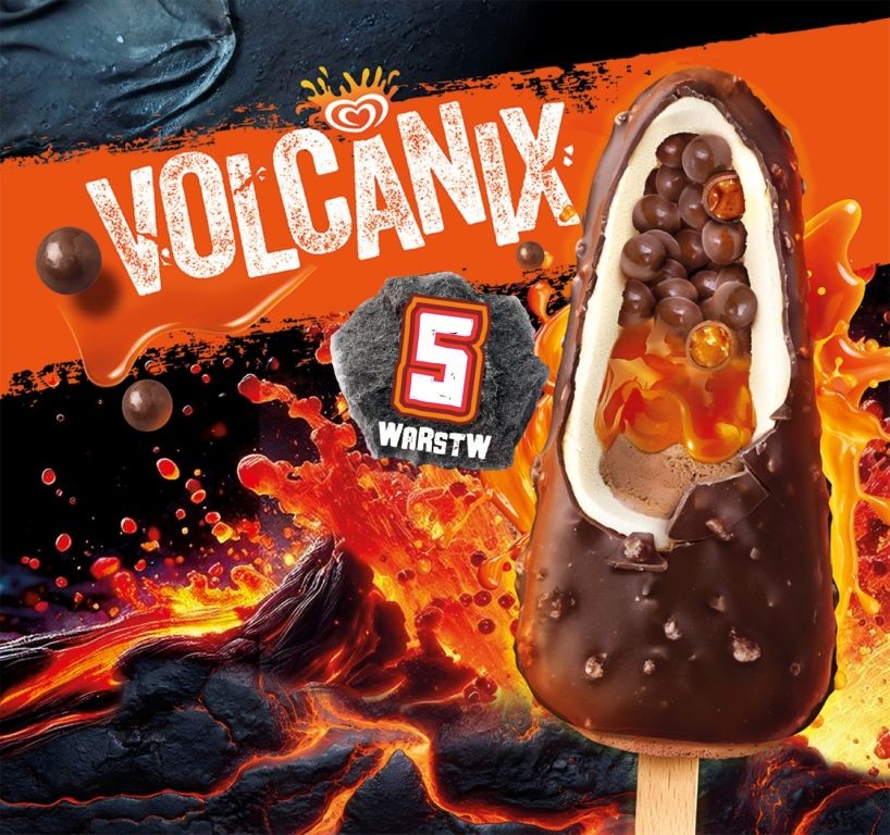 The Magnum Ice Cream Company wprowadza na polski rynek nowość w segmencie lodów impulsowych – Volcanix. To pierwszy w Europie wielowarstwowy lód na patyku, który łączy kremowe i chrupiące warstwy z czekoladową polewą, oferując nowe doświadczenie przekąski „on-the-go”. Debiut produktu w Polsce wzmacnia pozycję firmy na rynku lodów i stanowi kolejny etap europejskiej ekspansji tej innowacji.