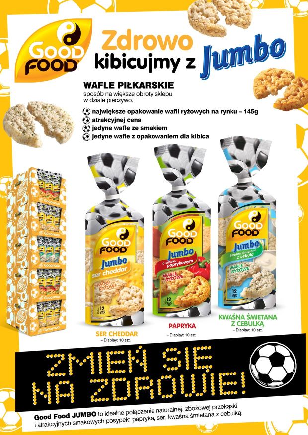 Zgodnie z zasadami „Zdrowego kibicowania” Good Food JUMBO łamią stereotyp „nudnych wafli”, gdyż są połączeniem naturalnej, zbożowej przekąski i atrakcyjnych smakowych posypek: papryka, ser, kwaśna śmietana z cebulką. Wafle smakowe JUMBO to wybór mniej kaloryczne przekąski, zarówno dla fanów sportu przed telewizorem, jak i aktywnych sportsmanów.. Produkt ten to sposób na uatrakcyjnienie segmentu pieczywa chrupkiego.