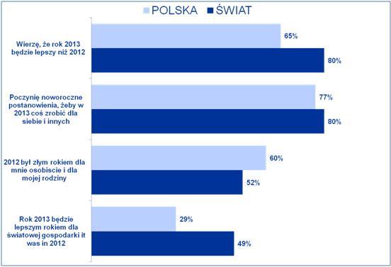Generalnie rzecz biorąc Polacy na tle pozostałych badanych społeczeństw plasują się w grupie pesymistów: rzadziej sądzą, że nadchodzący rok będzie lepszy od obecnego, częściej niż średnio na świecie twierdzą, że odchodzący rok był dla nich osobiście zły, są bardziej sceptyczni co do perspektyw światowej gospodarki w 2013.